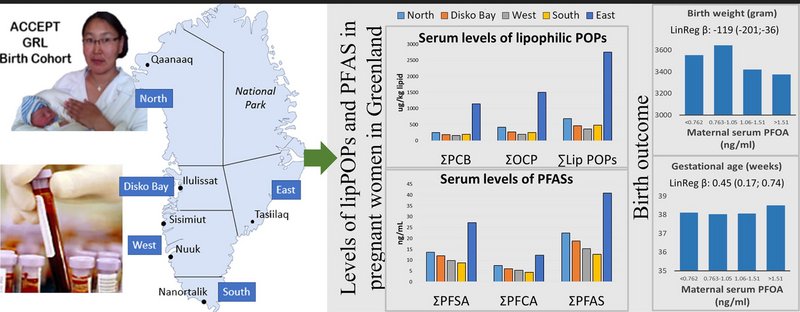 Pregnant Greenlandic women (n = 504) were enrolled during pregnancy and serum levels of the lipophilic POPs (Organochlorine pesticides, Polychlorinated biphenyls and Polybrominated diphenyl ethers) and the amphiphilic POPs, Perfluoroalkylated substances (PFASs), were measured. We analysed the associations between maternal serum levels of POPs and birth weight, length, head circumference and GA using linear regression analysis.