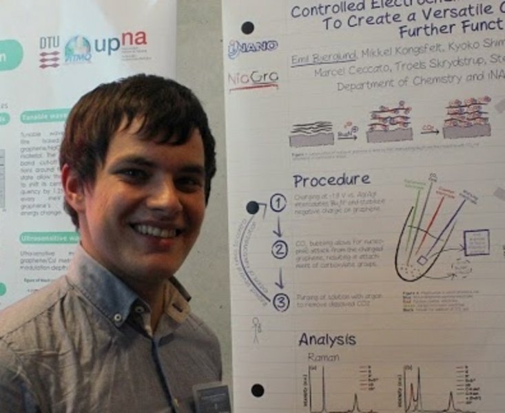 PhD student Emil Bjerglund Pedersen won 1st prize poster award for excellent presentation of scientific research at Carbonhagen 2014, the 5th anniversary symposium on carbon nanomaterials held 21-22 August 2014 in Copenhagen. The poster title was Controlled electrochemical carboxylation of graphene to create a versatile chemical platform for further functionalization. Emil Bjerglund Pedersen is PhD student in the research group of professor Kim Daasbjerg. | |