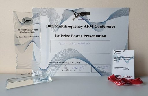 Congratulations to PhD student Judith Zubia Aranburu from the Interdisciplinary Nanoscience Center (iNANO) at Aarhus University, who was awarded the 1st Prize for Poster Presentation at the prestigious 10th Multifrequency Atomic Force Microscopy (AFM) Conference.