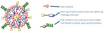 Ved at inkorporere platin i en nanokapsel med en diameter på ca. 100nm har forskerne effektivt øget størrelsen og dermed undgået optagelse i leveren. Nanokapslen er principielt en fedtdråbe, som er funktionaliseret ved at sætte platin sammen med en gruppe der sætter sig ind i fedtlaget. Platin er dermed bundet til fedtdråben (figur 1).