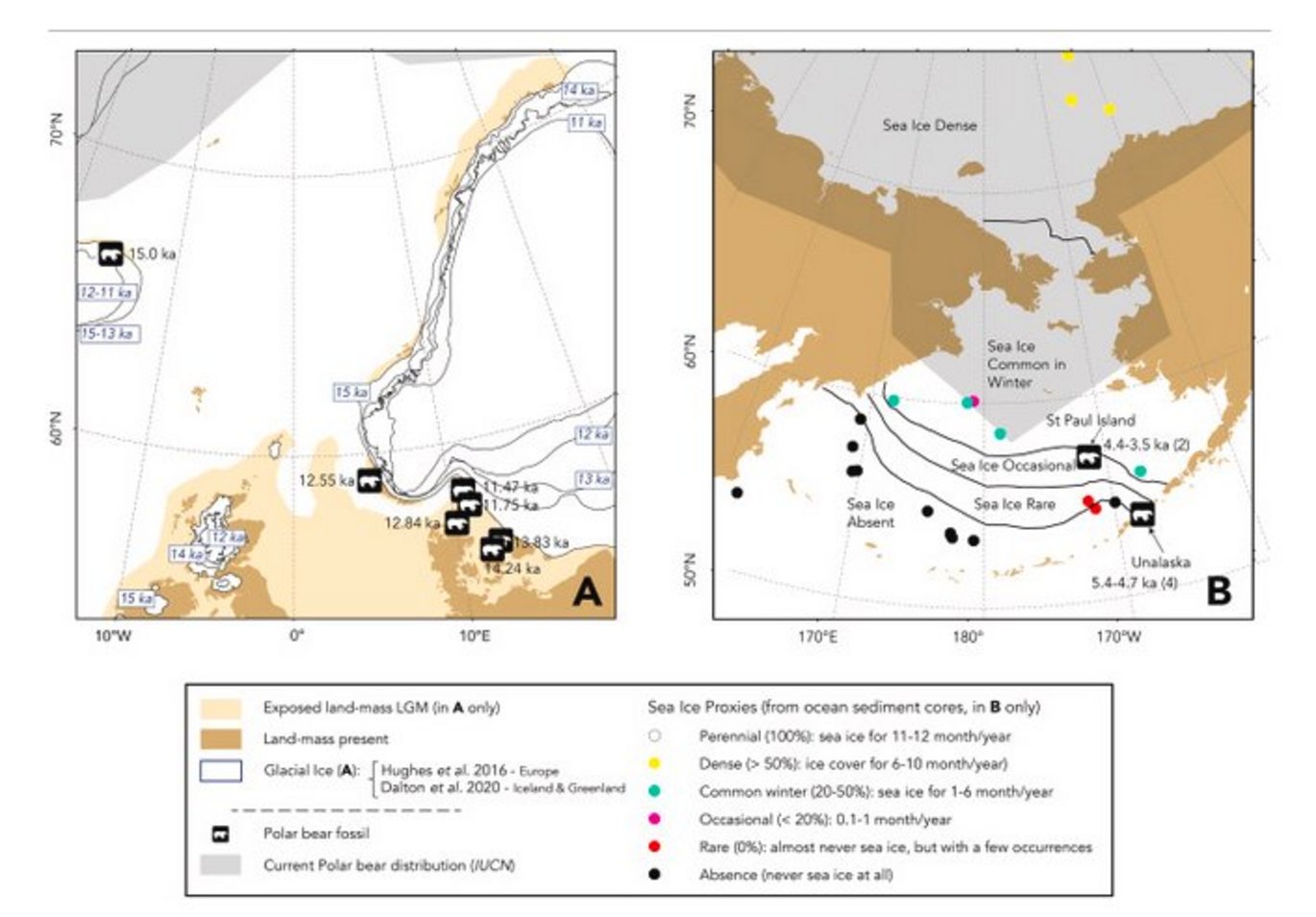 Polar bear (Ursus maritimus) is the apex predator of the Arctic, largely dependent on sea-ice. The expected disappearance of the ice cover of the Arctic seas by the mid 21st century is predicted to cause a dramatic decrease in the global range and population size of the species. To place this scenario against the backdrop of past distribution changes and their causes, we use a fossil dataset to investigate the polar bear's past distribution dynamics during the Late Glacial and the Holocene. Fossil results indicate that during the last deglaciation, polar bears were present at the southwestern margin of the Scandinavian Ice Sheet, surviving until the earliest Holocene. There are no Arctic polar bear findings from 8000–6000 years ago (8–6 ka), the Holocene's warmest period. However, fossils that date from 8-9 ka and 5–6 ka suggest that the species likely survived this period in cold refugia located near the East Siberian Sea, northern Greenland and the Canadian Archipelago. Polar bear range expansion is documented by an increase in fossils during the last 4000 years in tandem with cooling climate and expanding Arctic sea ice. The results document changes in polar bear's distribution in response to Late Glacial and Holocene Arctic temperature and sea ice trends.