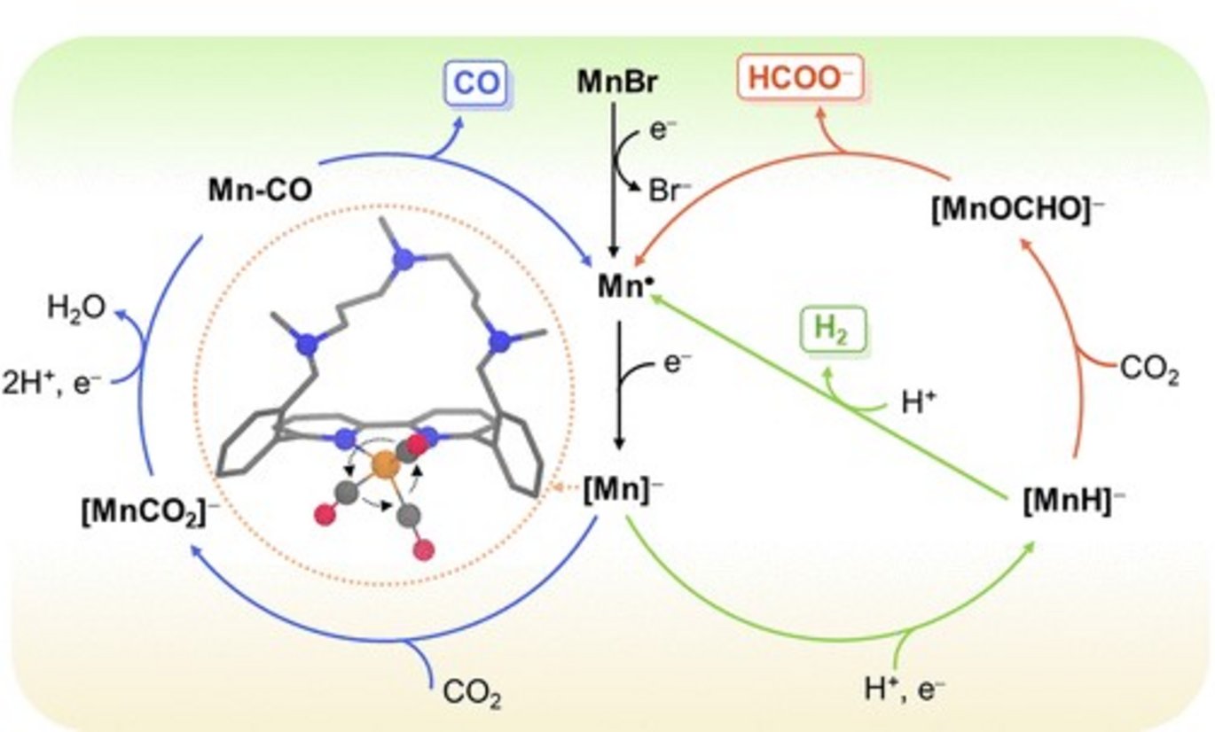 Abstract: Selective reduction of CO2 is an efficient solution for producing nonfossil-based chemical feedstocks and simultaneously alleviating the increasing atmospheric concentration of this greenhouse gas. With this aim, molecular electrocatalysts are being extensively studied, although selectivity remains an issue. In this work, a combined experimental–computational study explores how the molecular structure of Mn-based complexes determines the dominant product in the reduction of CO2 to HCOOH, CO, and H2. In contrast to previous Mn(bpy-R)(CO)3Br catalysts containing alkyl amines in the vicinity of the Br ligand, here, we report that bpy-based macrocycles locking these amines at the side opposite to the Br ligand change the product selectivity from HCOOH to H2. Ab initio molecular dynamics simulations of the active species showed that free rotation of the Mn(CO)3 moiety allows for the approach of the protonated amine to the reactive center yielding a Mn-hydride intermediate, which is the key in the formation of H2 and HCOOH. Additional studies with DFT methods showed that the macrocyclic moiety hinders the insertion of CO2 to the metal hydride favoring the formation of H2 over HCOOH. Further, our results suggest that the minor CO product observed experimentally is formed when CO2 adds to Mn on the side opposite to the amine ligand before protonation. These results show how product selectivity can be modulated by ligand design in Mn-based catalysts, providing atomistic details that can be leveraged in the development of a fully selective system.