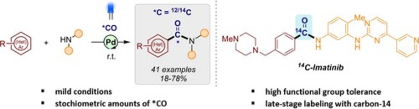 Abstract: In recent years, coupling reactions mediated by visible light have been widely studied because such reactions can often be run at significantly lower temperatures. In this work, aryl iodides were coupled with amines at ambient temperature in the presence of stoichiometric amounts of carbon monoxide using visible-light irradiation and palladium catalysis. A wide range of aryl substrates, both electron-deficient and rich, as well as heterocycles, were carbonylated to provide the corresponding amides in moderate to good yields based on CO. In addition, the generality of the amine was investigated, and primary and secondary amines yielded the desired products in moderate to good yields. This methodology was also successfully applied to the synthesis of pharmaceuticals and the incorporation of a carbon-14 label into the carbonyl group, where the use of 9-methyl-fluorene-9-carbonyl chloride (COgen) as the carbon isotope-labeled CO source allowed easy translation between the unlabeled and the labeled transformations.
