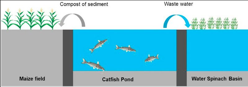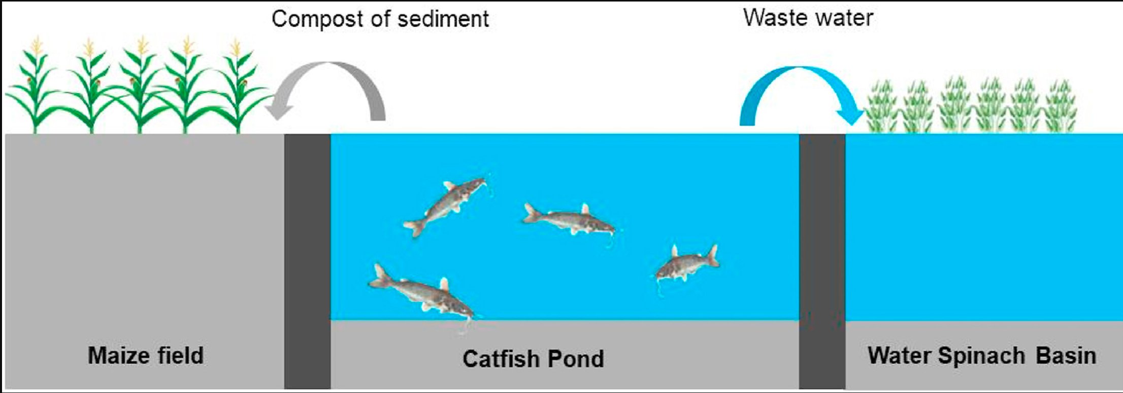 This study develops a method to reuse aquaculture wastewater and sediment from a catfish pond in order to increase agricultural productivity and protect the environment. Material flow analysis (MFA) is a central concept of this study that involves collecting catfish pond wastewater (CPW) and reusing it to irrigate five water spinach (Ipomoea aquatic) ponds before discharging it into a river. Typically, catfish pond sediment (CPS) was collected and composted to produce organic fertilizer for cornfields. The results revealed that pollutant removal efficiency of wastewater from CPW (by using water spinach) were total organic carbon (TOC) = 38.78%, nitrogen (N) = 27.07%, phosphorous (P) = 58.42%, and potassium (K) = 28.64%. By adding 20 tons of CPS compost per hectare of the cornfield, the corn yield boosted 15% compared to the control field. In addition, the water spinach grew and developed well in the medium of wastewater from the fish pond. Altogether, the results illustrate that catfish pond wastewater and sediment can act as organic fertilizers for crops meanwhile reduce environmental pollution from its reuse.
