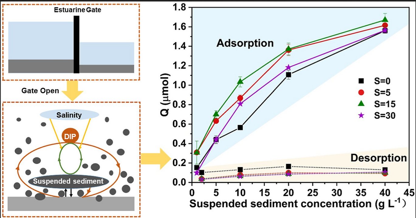 The flux of terrestrial dissolved inorganic phosphorous (DIP, i.e. PO43−) via rivers into coastal seas is usually calculated by simply multiplying its concentration with the corresponding water flow at the river mouth. Subsequent adsorption/desorption of DIP onto suspended sediment and the influence of salinity in the estuary are often overlooked. A series of DIP adsorption/desorption experiments under different salinities (0, 5, 15, 30) and suspended sediment concentrations (1–40 g L−1) were conducted in order to assess the potential influence of these factors on the overall DIP loading to the coastal zone. The effect of different sea-salt ions on DIP adsorption/desorption was also assessed by comparing different experimental solutions (NaCl solution, artificial seawater and real seawater). In estuaries, the adsorption of DIP to suspended sediments was greater than desorption, and the net adsorption increased with increasing concentration of suspended sediments and salinity. This enhanced DIP adsorption onto suspended sediment reduces the riverine discharge of DIP to coastal ecosystems. Disregarding this process, especially for the gated estuaries with high sediment resuspension, potentially leads to an overestimation of the terrestrial DIP input to the coastal region.