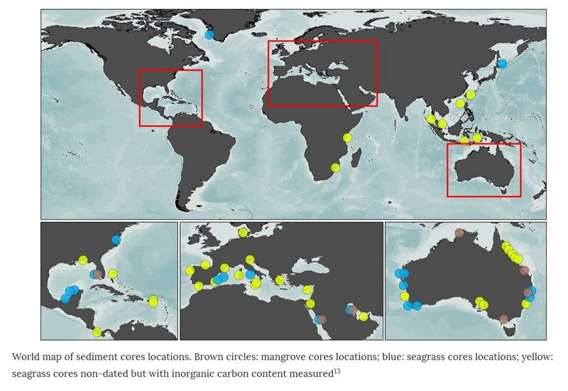 Calcium carbonates (CaCO3) often accumulate in mangrove and seagrass sediments. As CaCO3 production emits CO2, there is concern that this may partially offset the role of Blue Carbon ecosystems as CO2 sinks through the burial of organic carbon (Corg). A global collection of data on inorganic carbon burial rates (Cinorg, 12% of CaCO3 mass) revealed global rates of 0.8 TgCinorg yr−1 and 15–62 TgCinorg yr−1 in mangrove and seagrass ecosystems, respectively. In seagrass, CaCO3 burial may correspond to an offset of 30% of the net CO2 sequestration. However, a mass balance assessment highlights that the Cinorg burial is mainly supported by inputs from adjacent ecosystems rather than by local calcification, and that Blue Carbon ecosystems are sites of net CaCO3 dissolution. Hence, CaCO3 burial in Blue Carbon ecosystems contribute to seabed elevation and therefore buffers sea-level rise, without undermining their role as CO2 sinks.