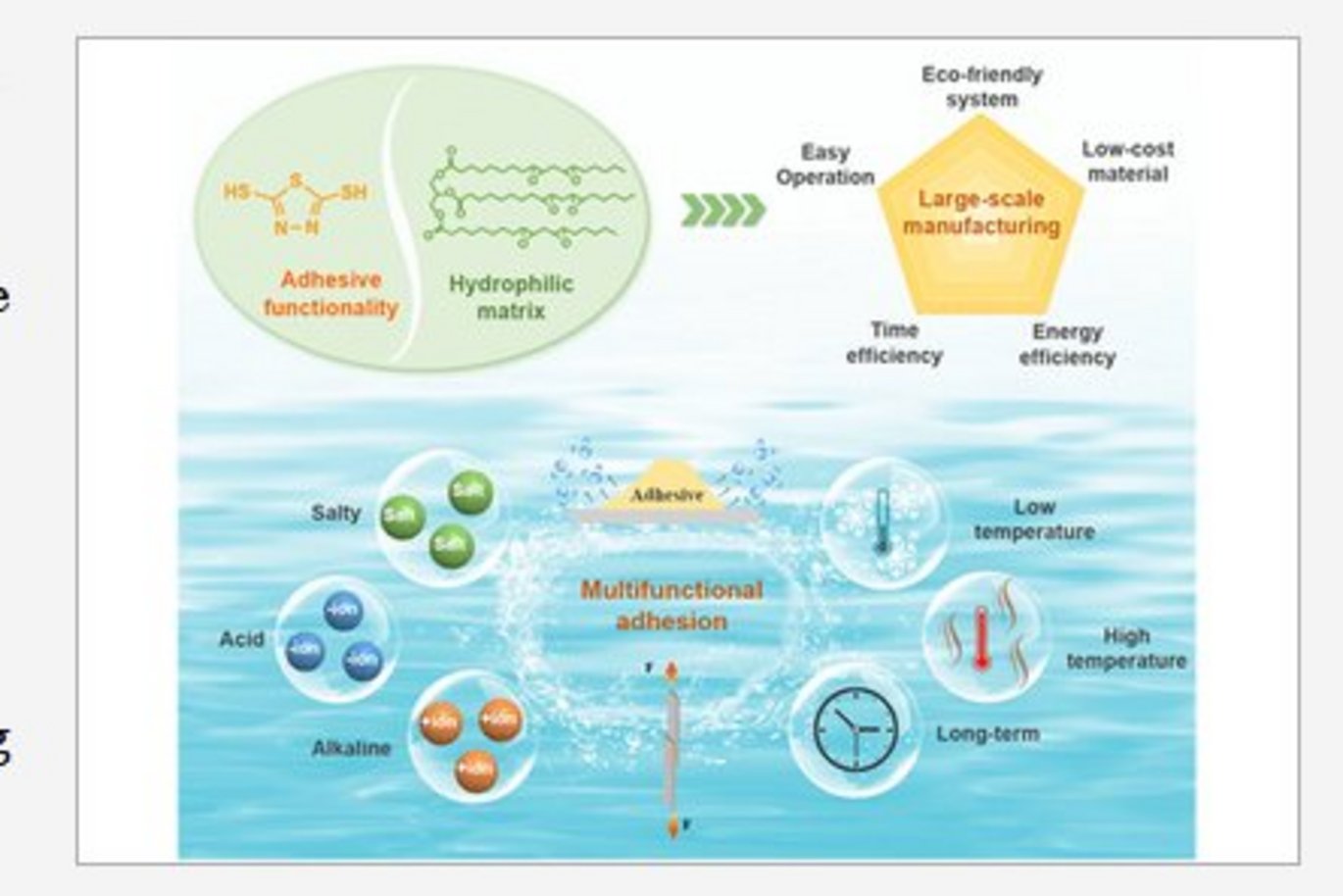 Developing scalable and high-performance underwater adhesives is important in various biomedical and industrial applications. However, despite massive efforts, the realization of such adhesives remains a challenging task, as mainly imposed by the difficulty in balancing the interfacial and bulk properties via an efficient way. Here, we report a facile yet effective strategy to construct a novel underwater adhesive with multiple advantaged performances by virtue of heterocyclic chemistry. This adhesive is designed with the cooperation of a heterocycle-based versatile adhesive functionality and an eco-friendly hydrophilic matrix with cross-linkable sites, which allows water absorption to destroy hydration layer, diverse molecular interactions to enhance interfacial adhesion, and abundant covalent crosslinks to strengthen bulk cohesion. Such a rational design endows the adhesive with strong underwater adhesion (up to 1.16 MPa for wood and 0.36 MPa for poly(tetrafluoroethylene) (PTFE)), long-term durability (maintaining pristine strength even after 4 months), and harsh-environment stability (salt, acidic/alkaline, low/high-temperature solutions). This strategy is also generic to derive more adhesive formulas, which offers a new direction for designing the next-generation underwater adhesives with high performance and scalability for practical applications.