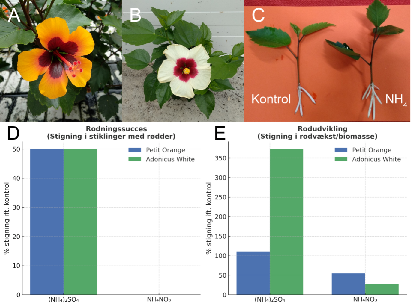 In an experiment with two Hibiscus varieties, ’Petit Orange’ and ’Adonicus White’, researchers from AU FOOD tested the effect of different nitrogen forms on the ability of cuttings to form roots.