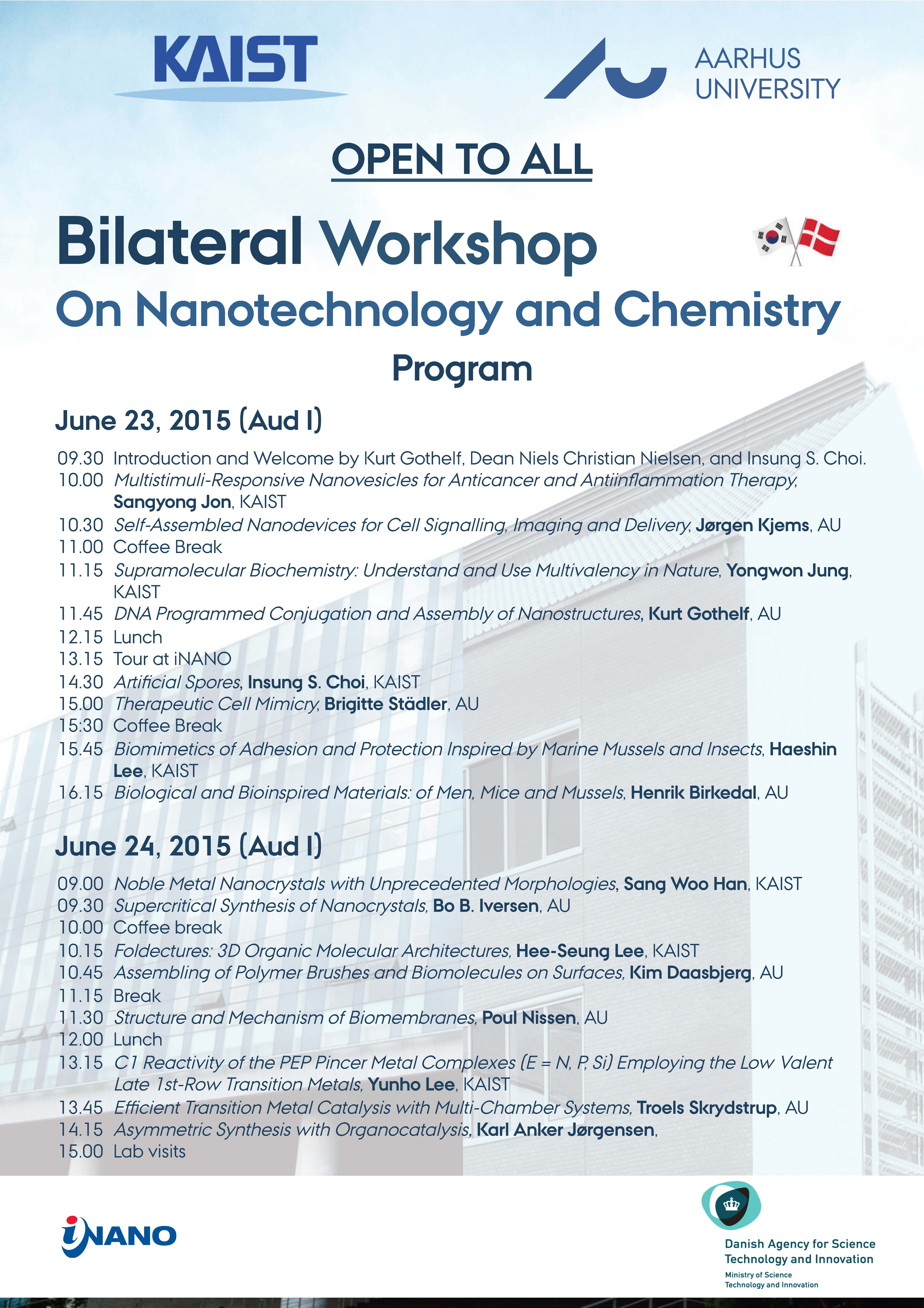 The workshop will consist of talks by seven group leaders from Department of Chemistry at Korea Advanced Institute of Science and Technology (KAIST) in South Korea, and researchers at iNANO and Department of Chemistry at Aarhus University (AU).