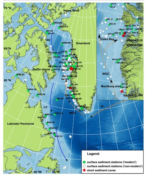 Evaluating and understanding bio-environmental relationships at different spatial and temporal scales is important for accurately assessing marine productivity in relation to oceanographic conditions in changing Arctic ecosystems. In this paper, we compare four different bio-environmental datasets, in order to shed new light on the complex marine ecosystem of the Baffin Bay-Labrador Sea region, as well as the historical links between environmental changes and the ecosystem. Satellite dataset was used to describe the regional distribution of chlorophyll a, sea ice concentration (SIC), sea surface temperature (SST) and sea surface salinity (SSS). Chlorophyll a data were also analysed together with shrimp assessment dataset to examine the relationship between marine pelagic productivity and bottom feeders off the Greenland coast. A microfossil dataset (diatom valves) from 57 surface sediment stations was used to describe diatom concentration and diversity across the study region. It was also used in combination with satellite data from the same sites to analyse species-environment relationships and develop a diatom-based transfer function for reconstructing past changes in SIC, SST and SSS. Subsequently, we applied the diatom transfer function on three short sediment cores from off SW and W Greenland spanning the last few centuries. A monitoring dataset of sea ice observations and instrumental measurements of water temperature and salinity, together with atmospheric data (air temperature and wind conditions) from Greenland, were used to develop a more complete picture of 20th and 21st century changes in ocean-climate conditions. Our comparative analyses show clear spatial distribution patterns of marine phytoplankton and identify key ecological groups linked to oceanic conditions. In addition, we find a significant correlation between the different trophic levels, culminating in a ‘productivity boom’ in 2001 CE. On a longer temporal scale, the transfer function reconstructions reveal a good correlation with the satellite, monitoring and observational trends, as well as a consistent, long-term decrease in sea ice linked to ocean-climate variability.