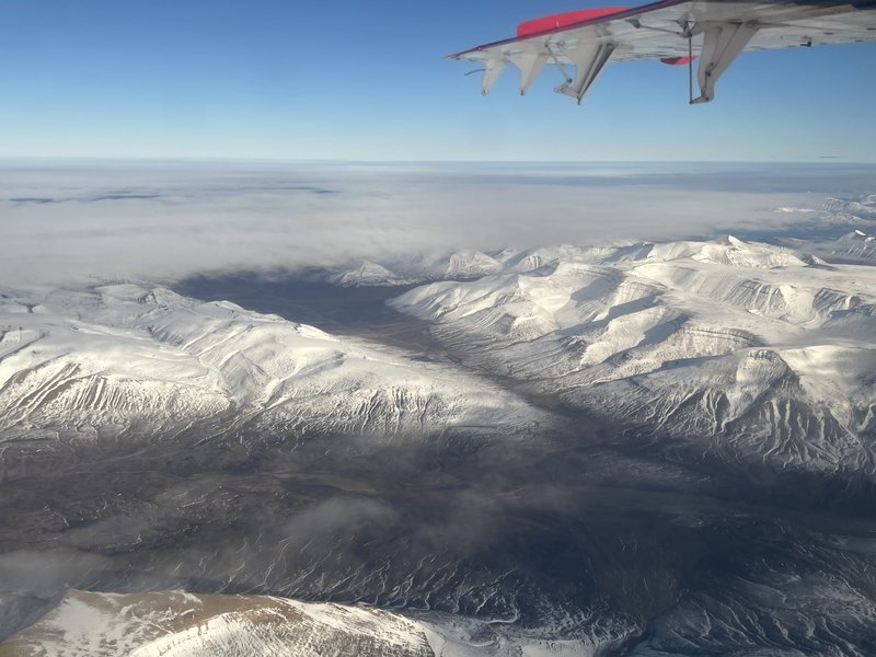 Piskeriset larmer infamt og drejer en halv omgang, så vi mister udsigten til hullet i søen. En mægtig støvsky omhyller os, før piloten sætter hjulene på jorden.