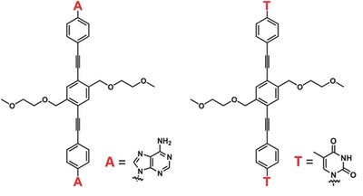 Man har kigget på et organisk molekyle, der består af tre aromatiske ringe. De tre ringe er koblet til hinanden via to karbon atomer med en trippel binding mellem de to. Den midterste aromatiske ring har to æter-arme. De to yderste aromatiske ringe ender på to forskellige enheder: adenine og thymine (Figur 1). Og selvom det meste af molekylet er ens og kun enderne er forskellige, har det en stor betydning på mønsterets arrangement.