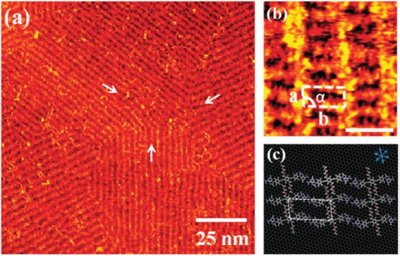 Figur 2. Ordning af adenine-molekylet. (a) Selvsamling af molekylet med adenine ender skete i en lineær konfiguration og man kan se rette linjer af ordnede molekyler på overfladen. (b) Enhedscellen - er et rektangel (c) Skematisk repræsentation af selvsamlingsmønsteret: adenine ender af to forskellige molekyler peger mod hinanden.
