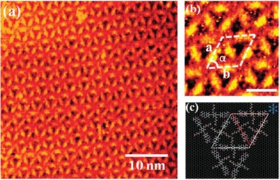 Figur 3. Ordning af thymine-molekylet. (a) Sekskantet stjerne-mønster der dækker hele overfladen. (b) Enhedscellen er et parallelogram (c) Skematisk repræsentation af selvsamlingsmønster: thymine ender af seks forskellige molekyler peger mod hinanden og danner et sekskantet mønster.