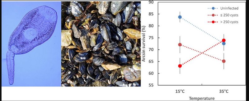 Blue mussels (Mytilus edulis) are important ecosystem engineers along Atlantic coastlines, where they are regularly subjected to rapid changes in temperature during the transition between tides. Global climate change and more frequent extreme weather events are expected to intensify this thermal stress even further. These increases in temperatures will not only affect intertidal mussels directly but also increase transmission dynamics of their parasites. Together, the effects of rises in temperature and parasitism will likely result in higher pressure on M. edulis and their ability to perform vital ecosystem services. In a set of experiments, we tested the effects of infections with the trematode Himasthla elongata and high temperatures during low tide air-exposure. Overall, we hypothesised that temperature and parasite infection intensity would each have significant negative effects on M. edulis survival, and that both stressors together would have a synergistic detrimental impact. Overall, high temperature levels had a strong negative effect on mussel survival. However, our results revealed a surprisingly more complex picture in infected individuals. While moderate parasite loads and increased temperature showed additive negative effects on mussel survival, high parasite infection intensities appeared to nullify the detrimental effects of temperature stress on mussels. Under climate warming, these benefits of parasites might actually outweigh the costs of infection and prove beneficial. Overall, these results suggest that the interactions between host–parasite systems and their changing environment are much more complex than a simple additive effect of multiple stressors.