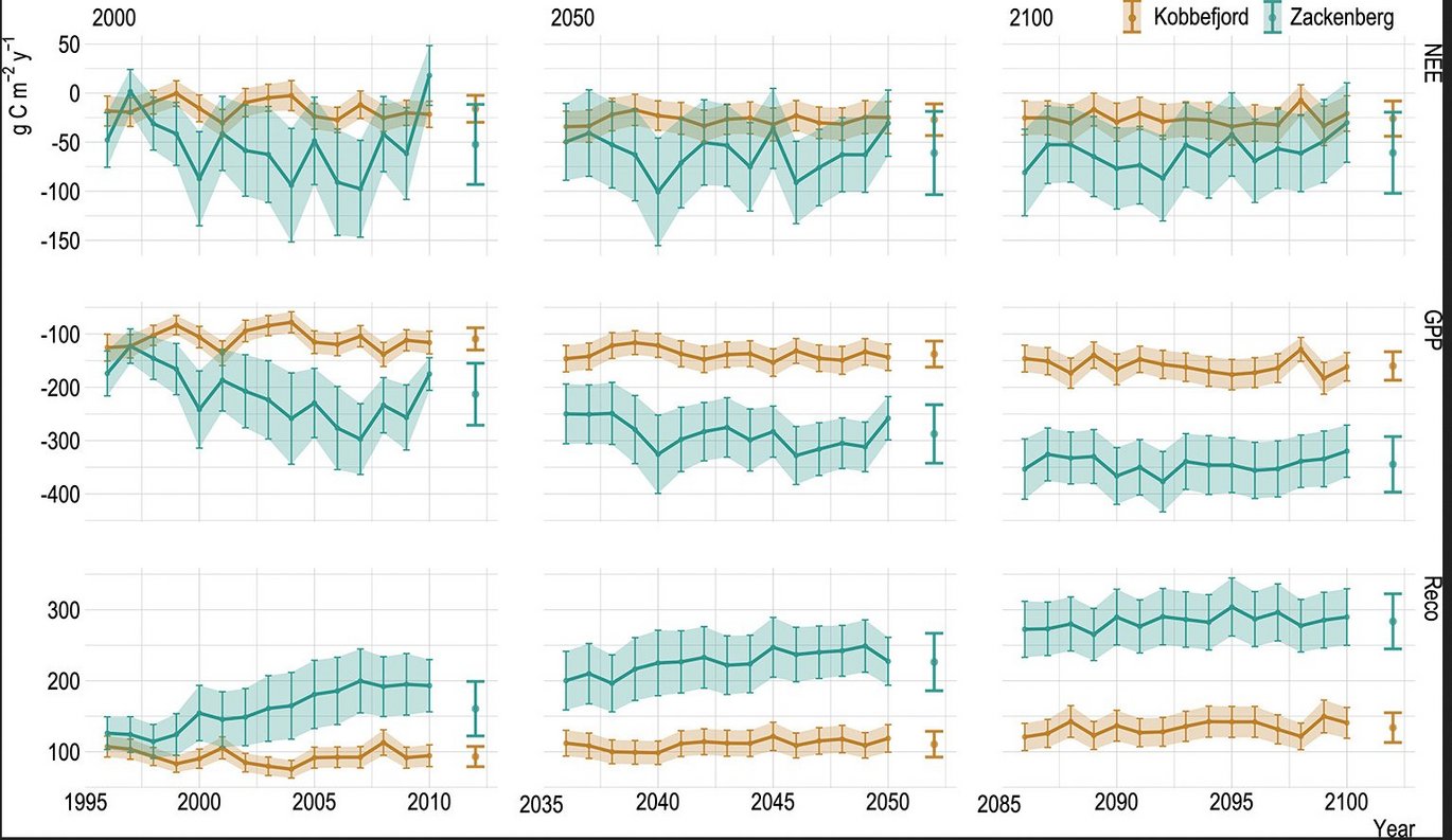 This work proves the unique synergy between monitoring data and numerical models to assist robust model calibration/validation and narrow uncertainty ranges and ultimately produce more reliable C cycle projections in understudied regions such as Greenland.