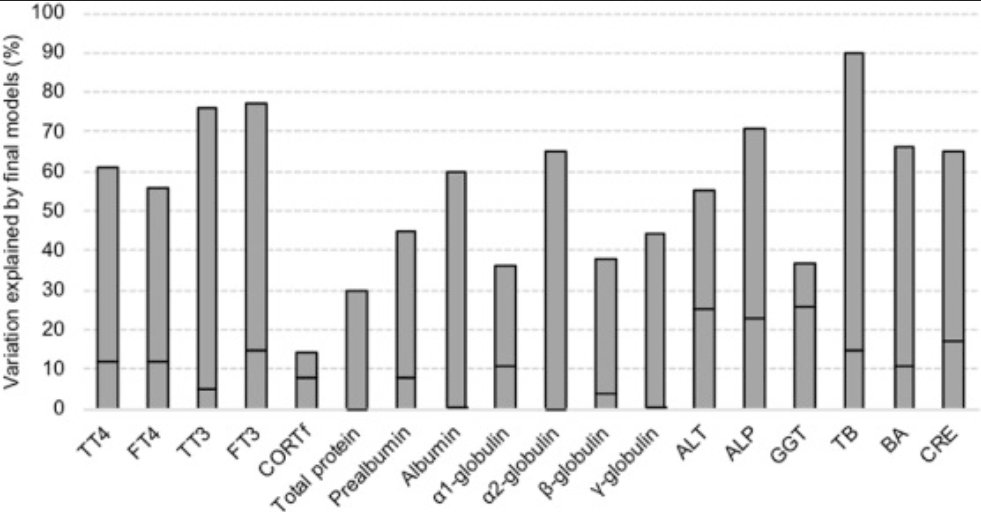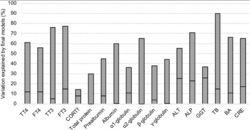 Environmental exposure to organohalogenated contaminants (OHCs), even at low concentrations, may cause detrimental effects on the development and health of wild birds. The present study investigated if environmental exposure to OHCs may influence the variation of multiple physiological parameters in Norwegian white-tailed eagle (Haliaeetus albicilla) nestlings. Plasma and feather samples were obtained from 70 nestlings at two archipelagos in Norway in 2015 and 2016. The selected physiological parameters were plasma concentrations of thyroid hormones (thyroxine, T4 and triiodothyronine, T3), plasma proteins (prealbumin, albumin, α1-, α2-, β- and γ-globulins) and selected blood clinical chemical parameters (BCCPs) associated with liver and kidney functioning. Feather concentrations of corticosterone (CORTf) were also included to investigate the overall stress level of the nestlings. Concentrations of all studied physiological parameters were within the ranges of those found in other species of free-living birds of prey nestlings and indicated that the white-tailed eagle nestlings were in good health. Our statistical models indicated that perfluoroalkyl substances (PFASs) and legacy OHCs, such as polychlorinated biphenyls, organochlorinated pesticides and polybrominated diphenyl ethers, influenced only a minor fraction of the variation of plasma thyroid hormones, prealbumin and CORTf (5–15%), and partly explained the selected BCCPs (<26%). Most of the variation in each studied physiological parameter was explained by variation between nests, which is most likely due to natural physiological variation of nestlings in these nests. This indicates the importance of accounting for between nest variation in future studies. In the present nestlings, OHC concentrations were relatively low and seem to have played a secondary role compared to natural variation concerning the variation of physiological parameters. However, our study also indicates a potential for OHC-induced effects on thyroid hormones, CORTf, prealbumin and BCCPs, which could be of concern in birds exposed to higher OHC concentrations than the present white-tailed eagle nestlings.