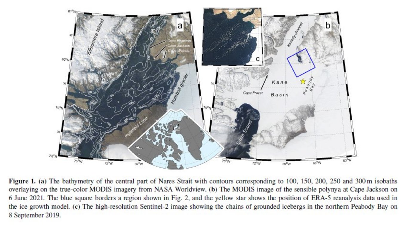 areas within the ice bridge are then suggested to promote instability and earlier breakup. This work provides new insight into the structure of the Nares Strait ice bridge and highlights that warming of the modified Atlantic and/or Pacific waters that enter the strait may contribute to its further decline.