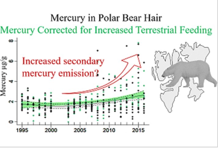 Temporal trends of total mercury (THg) were examined in female polar bear (Ursus maritimus) hair (n = 199) from the Barents Sea in 1995–2016. In addition, hair values of stable isotopes (n = 190–197) of carbon (δ13C), sulfur (δ34S), and nitrogen (δ15N) and information on breeding status, body condition, and age were obtained. Stable isotope values of carbon and sulfur reflect dietary source (e.g., marine vs terrestrial) and the nitrogen trophic level. Values for δ13C and δ34S declined by −1.62 and −1.18‰ over the time of the study period, respectively, while values for δ15N showed no trend. Total Hg concentrations were positively related to both δ13C and δ34S. Yearly median THg concentrations ranged from 1.61 to 2.75 μg/g and increased nonlinearly by 0.86 μg/g in total over the study. Correcting THg concentrations for stable isotope values of carbon and sulfur and additionally breeding status and age slightly accelerated the increase in THg concentrations; however, confidence intervals of the raw THg trend and the corrected THg trend had substantial overlap. The rise in THg concentrations in the polar bear food web was possibly related to climate-related re-emissions of previously stored Hg from thawing sea-ice, glaciers, and permafrost.