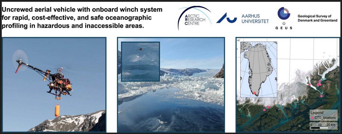 Interactions between coastal waters and marine-terminating glaciers in the Polar Regions play a significant role in global sea level rise fueled by a rapidly warming Arctic. The risk of glacier calving, and the abundance of ice, can make it impossible for surface vessels to access the waters near glacier termini. Alternative methods using manned aircraft are expensive. As a result, oceanographic measurements are limited near glacier termini.We present an uncrewed aerial vehicle (UAV) with an on-board winch system that allows oceanographic profiling in remote, hazardous areas using a commercial conductivity, temperature, and depth (CTD) sensor payload. The UAV is optimized for easy handling and deployment and is capable of high-speed and efficient cruise flight. An autopilot system provides pilot assistance and autonomous flight capabilities. The total weight of the UAV including payload is 6.5 kg with an endurance of 24 min.Testing of the system was conducted in South Greenland during winter conditions in March 2023 with successful profiles collected near a glacier terminus (<5 m) and in small openings in ice mélange (2.2 m). The system proved capable, reliable, and efficient. Further development of the system will allow other sensors for an even more flexible measurement suite.