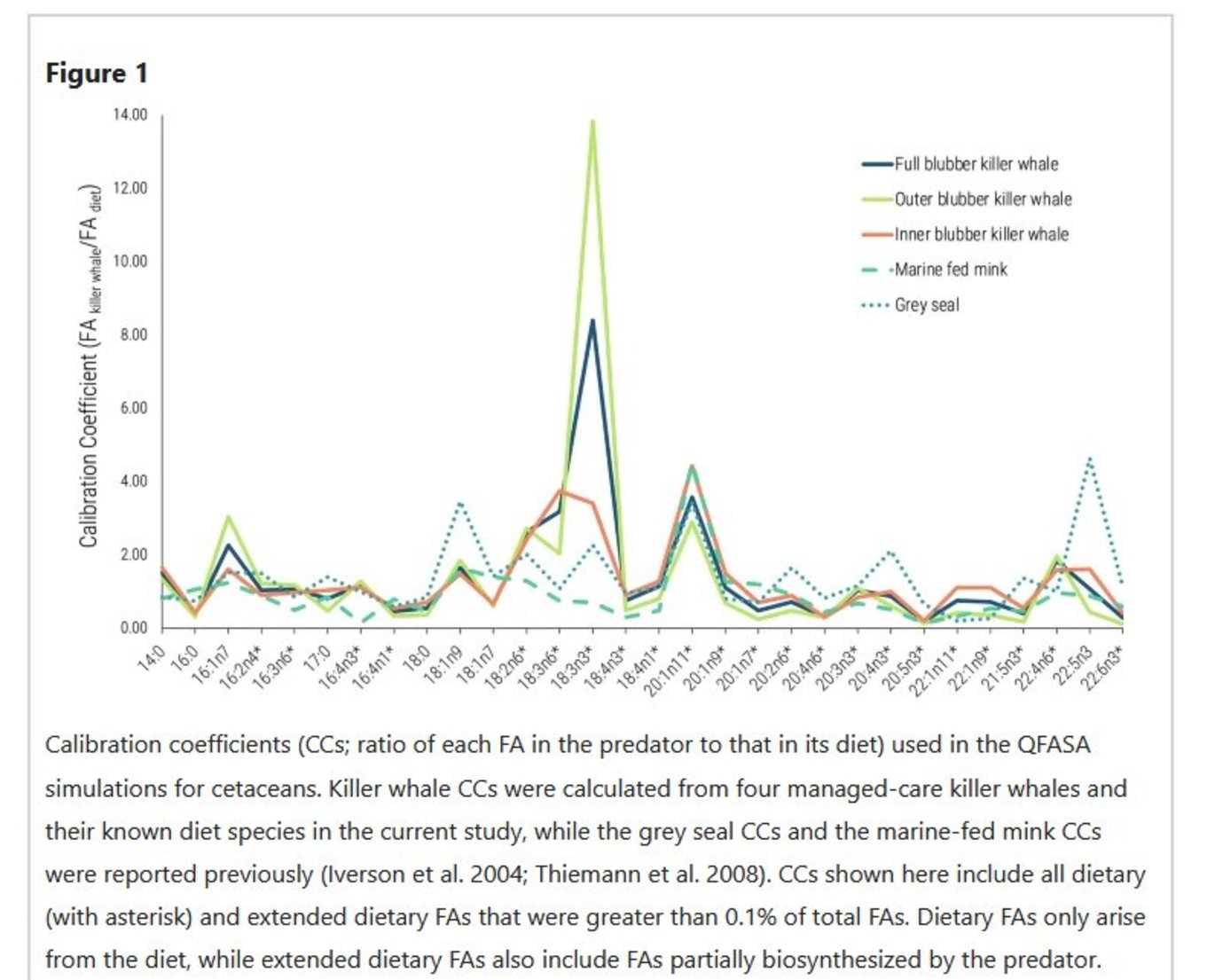 Accurate diet estimates are necessary to assess trophic interactions and food web dynamics in ecosystems, particularly for apex predators like cetaceans, which can regulate entire food webs. Quantitative fatty acid analysis (QFASA) has been used to estimate the diets of marine predators in the last decade but has yet to be implemented on free-ranging cetaceans, from which typically only biopsy samples containing outer blubber are available, due to a lack of empirically determined calibration coefficients (CCs) that account for fatty acid (FA) metabolism. Here, we develop and validate QFASA for killer whales using full blubber from managed-care and free-ranging individuals. First, we compute full, inner, and outer blubber CCs from the FA signatures across the blubber layers of managed-care killer whales and their long-term diet items. We then run cross-validating simulations on the managed-care individuals to evaluate the accuracy of diet estimates by comparing full-depth and depth-specific estimates to true diets. Finally, we apply these approaches to subsistence-harvested killer whales from Greenland to test the utility of the method for free-ranging killer whales, particularly for the outer blubber. Accurate diet estimates for the managed-care killer whales were only achieved using killer whale-specific and blubber-layer-specific CCs. Modeled diets for the Greenlandic killer whales largely consisted of seals (75.9 ± 4.7%) and/or fish (20.4 ± 2.4%), mainly mackerel, which was consistent with stomach content data and limited literature on this population. Given the remote habitats and below surface feeding of most cetaceans, this newly developed cetacean-specific QFASA method, which can be applied to outer-layer biopsies, offers promise to provide a significant new understanding of diet dynamics of free-ranging odontocetes and perhaps other cetacean species throughout the world’s oceans.