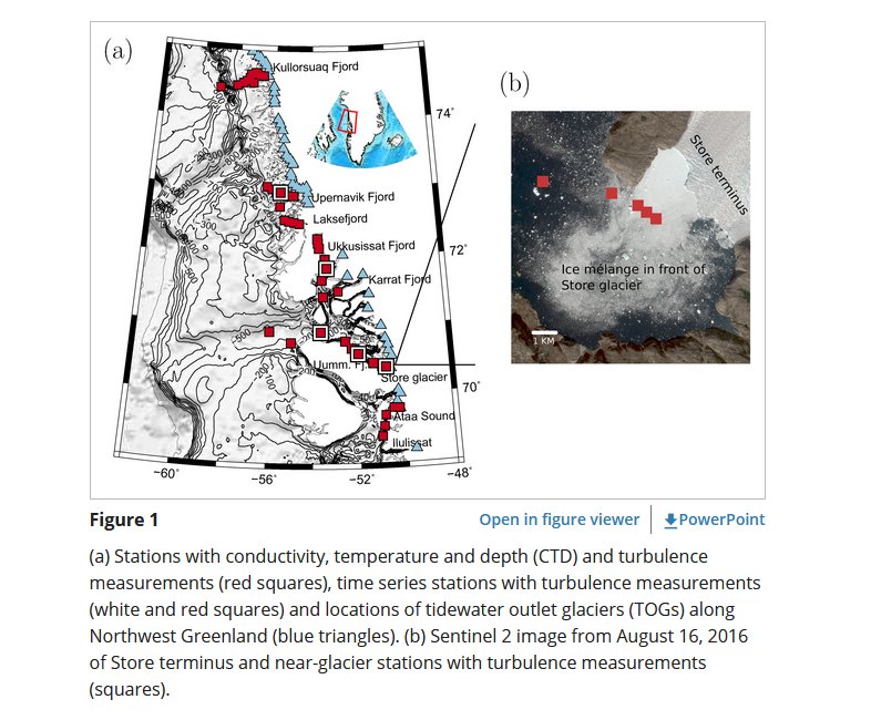 Vertical mixing of upper water masses in Arctic fjords is important for circulation and transport of nutrients and heat. However, the distribution of turbulent mixing is poorly known. Here we present hydrographic and microscale turbulence measurements from six fjords in Northwestern (69°N–75°N) Greenland. Water mass distributions showed the presence of warm bottom water of Atlantic origin in all fjord transects and a significant modification of upper water masses in fjords with tidewater outlet glaciers. Spatial and temporal distribution of turbulence in the fjords showed, in general, low rates of turbulent kinetic energy, ε (∼10−9 W kg−1), and strong stratification implies that vertical exchange in the upper ∼200 m was relatively weak. However, measurements within 2 km of the terminus of a tidewater outlet glacier showed values of ε and inferred turbulent diffusion coefficients >10−4 m2 s−1 that were about two orders of magnitude larger than elsewhere in the deep fjords. This elevated mixing corresponded to comparatively large heat and salt fluxes. These observations suggest that vertical mixing near tidewater outlet glaciers results in localized mixing hot spots, likely due to subglacial discharge and near-glacial current shear, that contribute significantly to vertical exchange in the deep fjords.