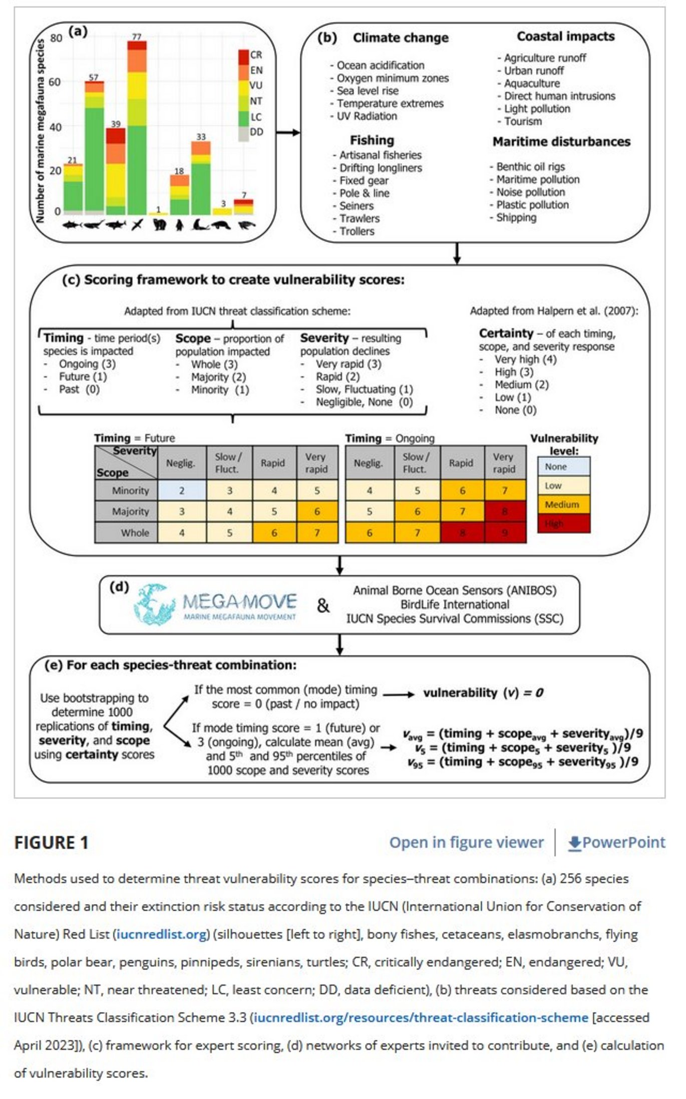 Marine megafauna species are affected by a wide range of anthropogenic threats. To evaluate the risk of such threats, species’ vulnerability to each threat must first be determined. We build on the existing threats classification scheme and ranking system of the International Union for Conservation of Nature (IUCN) Red List of Threatened Species by assessing the vulnerability of 256 marine megafauna species to 23 at-sea threats. The threats we considered included individual fishing gear types, climate-change-related subthreats not previously assessed, and threats associated with coastal impacts and maritime disturbances. Our ratings resulted in 70 species having high vulnerability (v > 0.778 out of 1) to at least 1 threat, primarily drifting longlines, temperature extremes, or fixed gear. These 3 threats were also considered to have the most severe effects (i.e., steepest population declines). Overall, temperature extremes and plastics and other solid waste were rated as affecting the largest proportion of populations. Penguins, pinnipeds, and polar bears had the highest vulnerability to temperature extremes. Bony fishes had the highest vulnerability to drifting longlines and plastics and other solid waste; pelagic cetaceans to 4 maritime disturbance threats; elasmobranchs to 5 fishing threats; and flying birds to drifting longlines and 2 maritime disturbance threats. Sirenians and turtles had the highest vulnerability to at least one threat from all 4 categories. Despite not necessarily having severe effects for most taxonomic groups, temperature extremes were rated among the top threats for all taxa except bony fishes. The vulnerability scores we provide are an important first step in estimating the risk of threats to marine megafauna. Importantly, they help differentiate scope from severity, which is key to identifying threats that should be prioritized for mitigation.