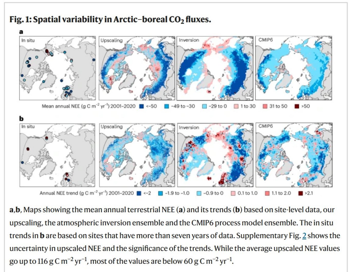 The Arctic–Boreal Zone is rapidly warming, impacting its large soil carbon stocks. Here we use a new compilation of terrestrial ecosystem CO2 fluxes, geospatial datasets and random forest models to show that although the Arctic–Boreal Zone was overall an increasing terrestrial CO2 sink from 2001 to 2020 (mean ± standard deviation in net ecosystem exchange, −548 ± 140 Tg C yr−1; trend, −14 Tg C yr−1; P < 0.001), more than 30% of the region was a net CO2 source. Tundra regions may have already started to function on average as CO2 sources, demonstrating a shift in carbon dynamics. When fire emissions are factored in, the increasing Arctic–Boreal Zone sink is no longer statistically significant (budget, −319 ± 140 Tg C yr−1; trend, −9 Tg C yr−1), and the permafrost region becomes CO2 neutral (budget, −24 ± 123 Tg C yr−1; trend, −3 Tg C yr−1), underscoring the importance of fire in this region.