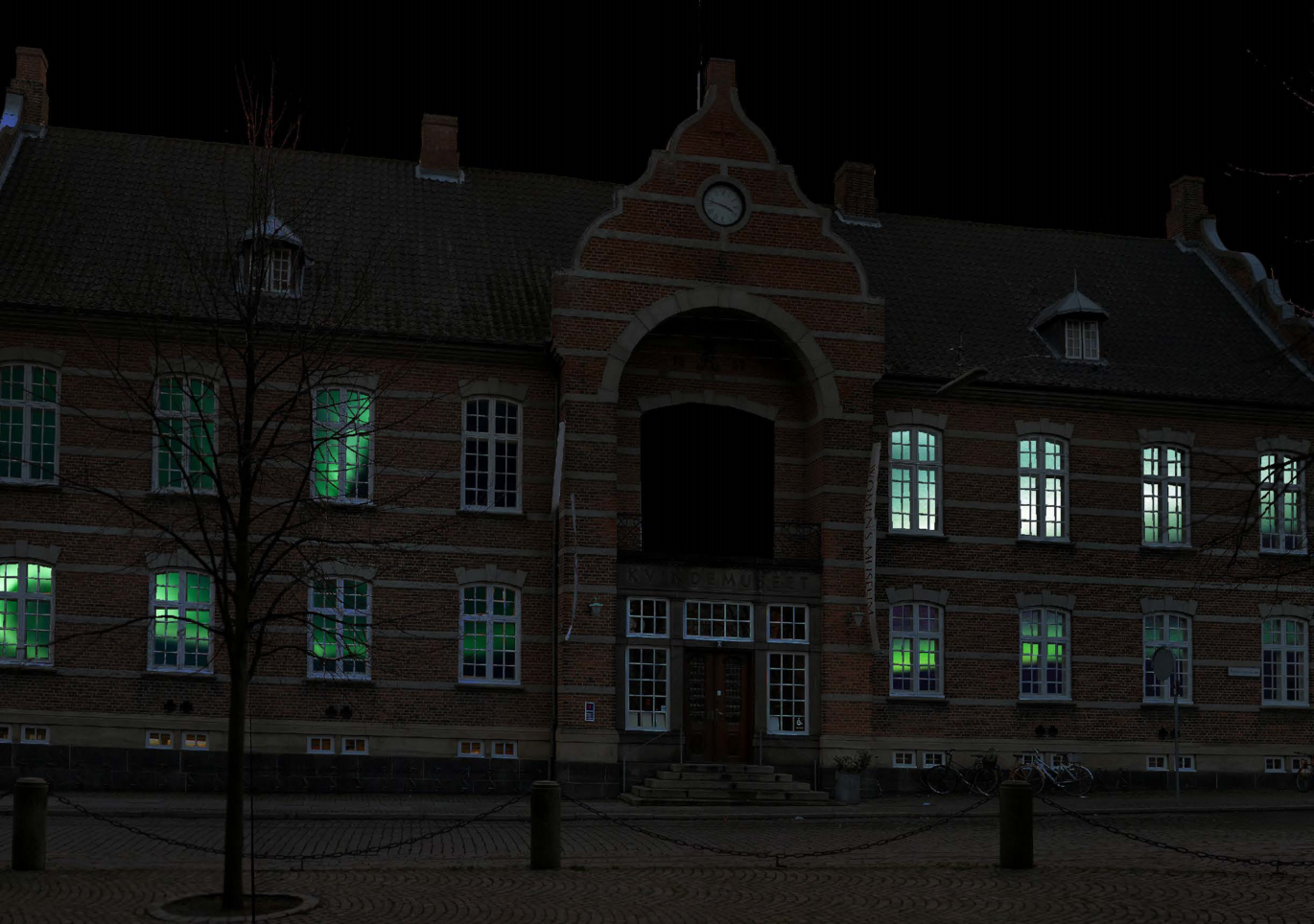 CAVI has collaborated with visual artist Signe Klejs in creating Zeitgeist, an adaptive media façade for the Women’s Museum in Aarhus. Zeitgeist is a site specific work active in the darkness at night with colors moving across the façade in the surface of the windows. The dynamics and movements of the light are influenced by direction and speed of the wind measured by an anemometer situated at the rooftop. Velocity and change expressed this way are hinting to core concepts of the Women’s Museum where communication of the change of our understanding of gender, and gender related subjects, varies over time. The colors of the installation are sampled directly from the stained glass in the hallway, and connects the installation with the town hall of Aarhus from 1908, now housing the museum.
